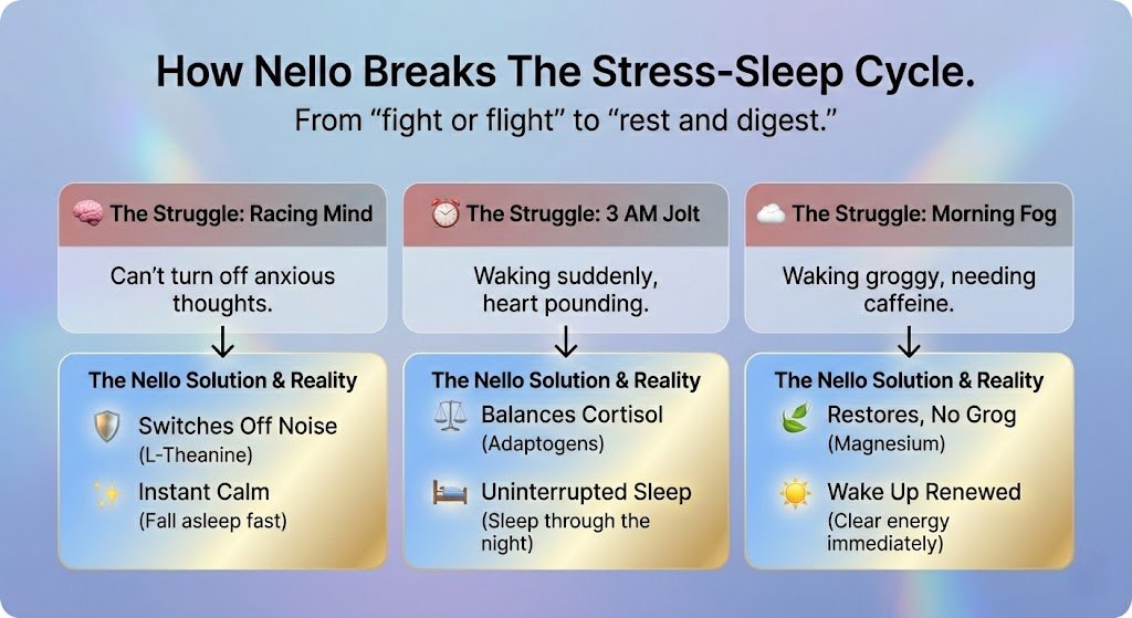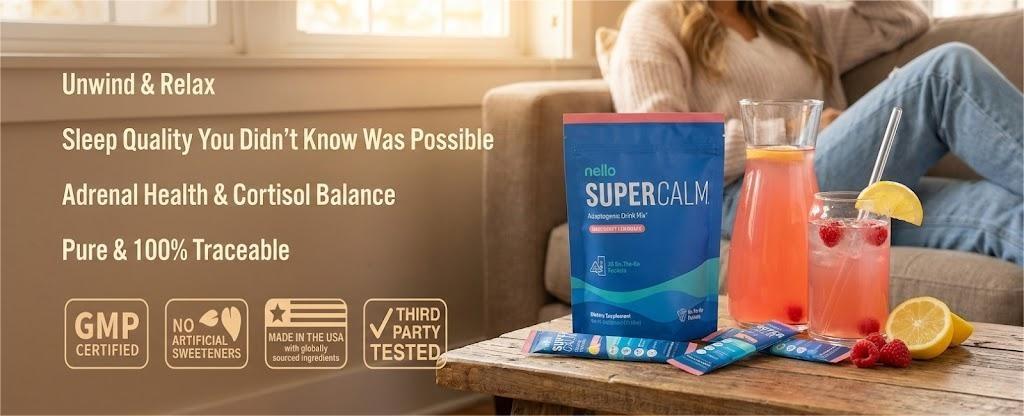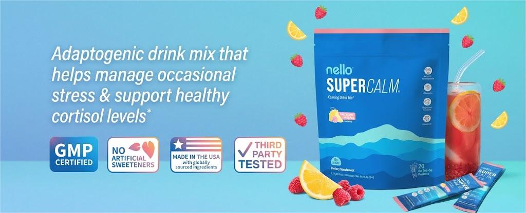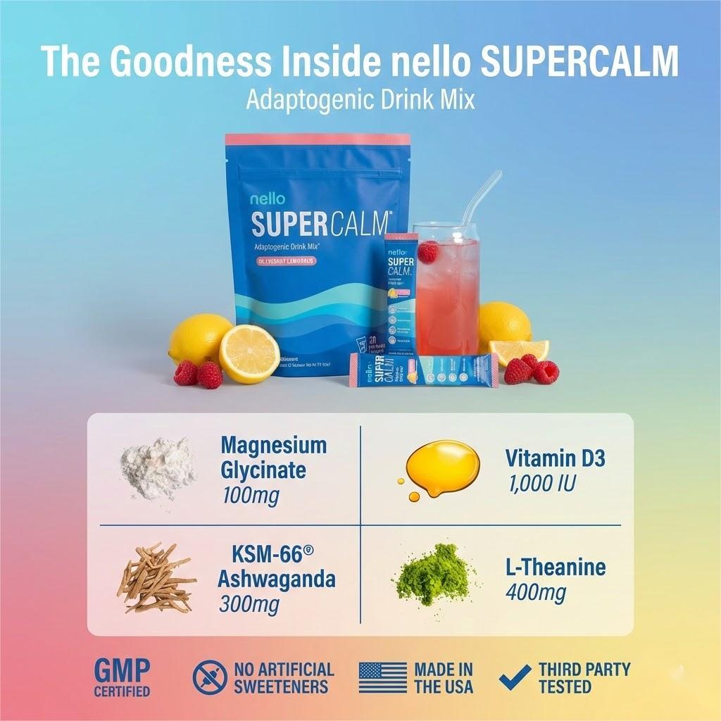 SuperCalm Stress Relief Drink Mix helps balance cortisol levels, reduce stress, and promote restful sleep with a scientifically-formulated blend of adaptogens, L-Theanine, and magnesium.